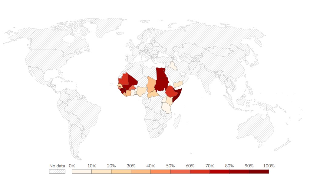 La OMS documenta que la MGF se practica en al menos 92 países de África, Medio Oriente y Asia, y también aparece en comunidades de la diáspora (OMS, 2025). Un reporte global de UNICEF estima la distribución así (UNICEF, 2024):